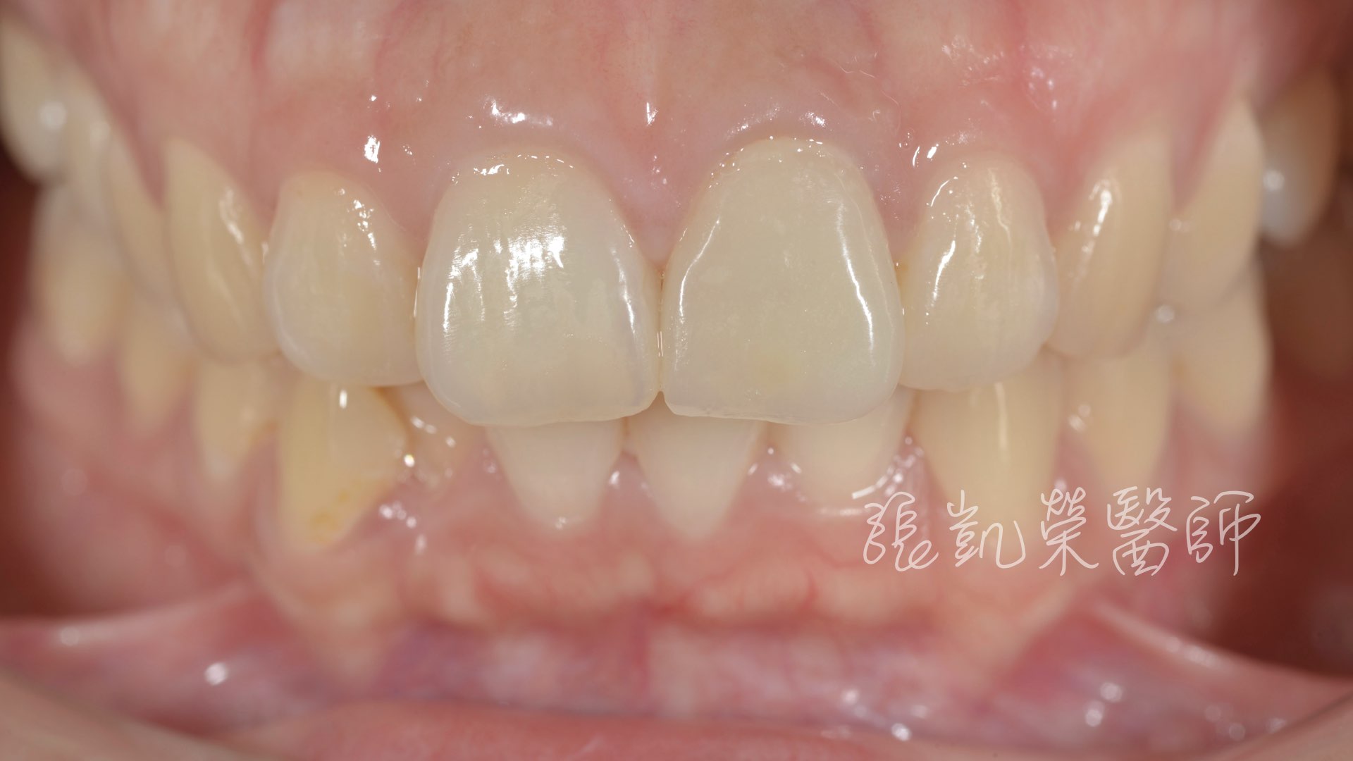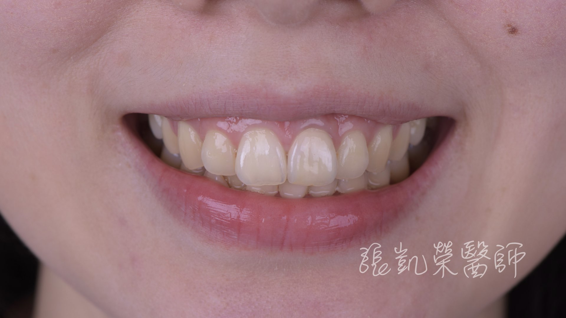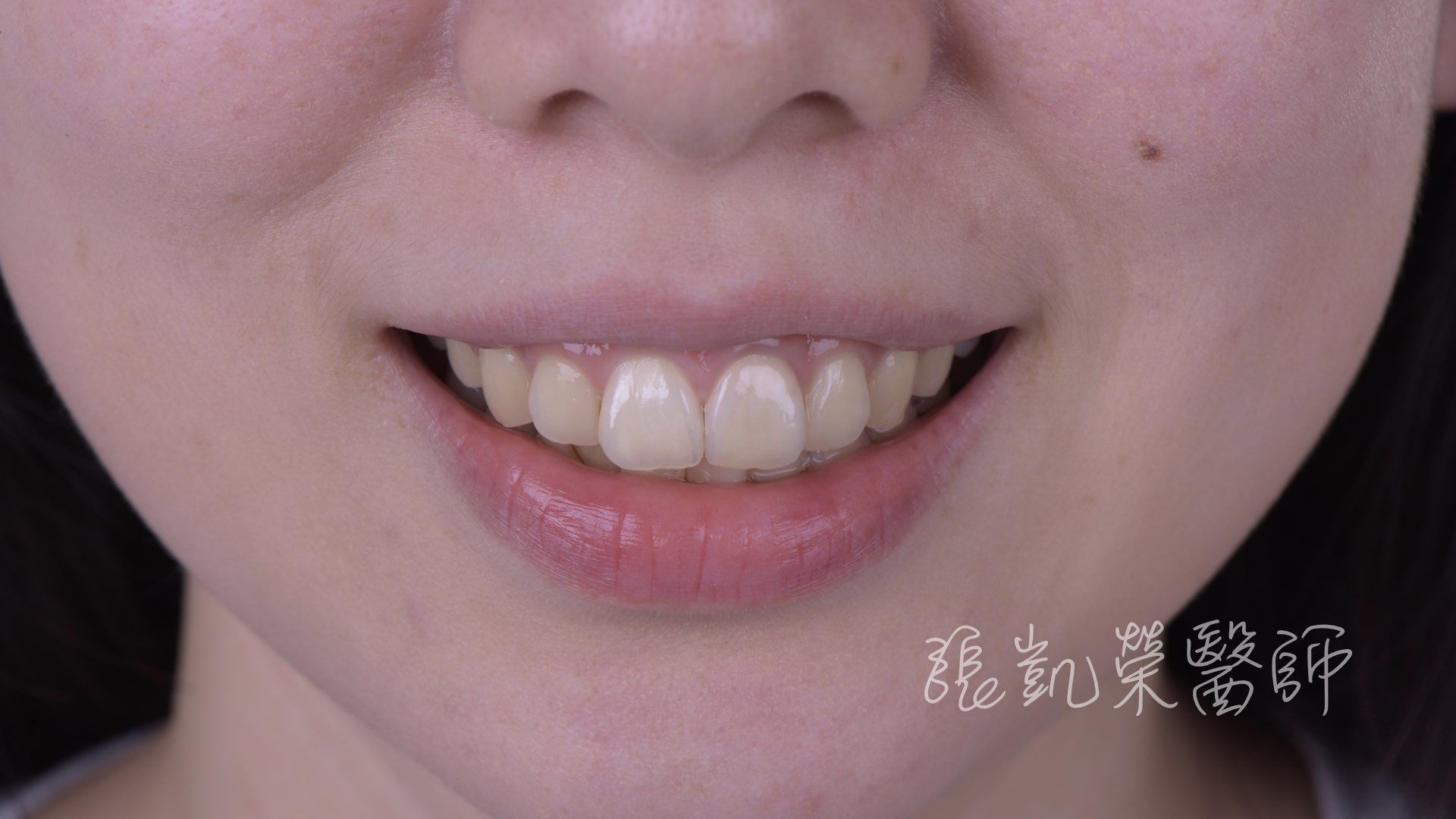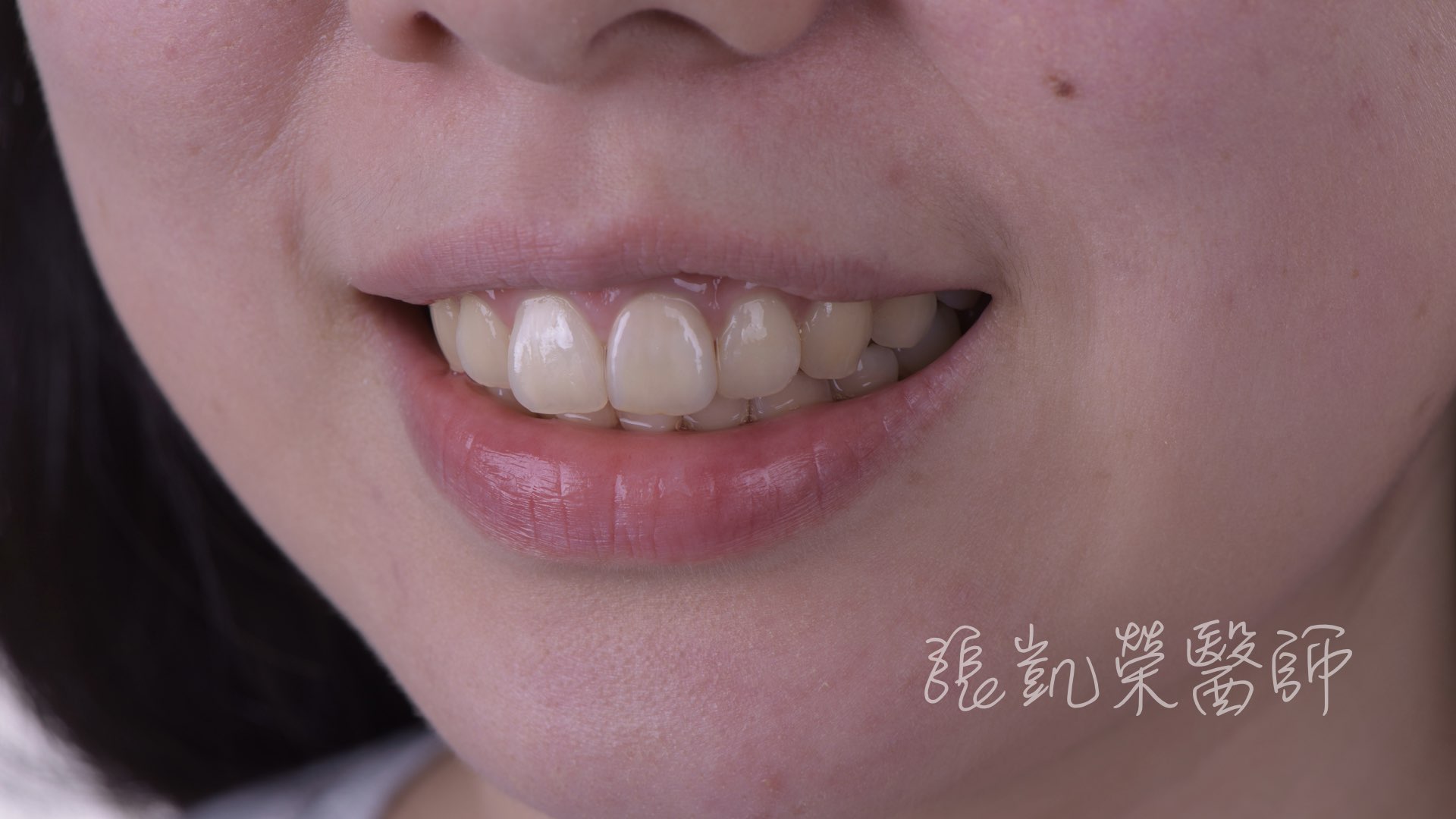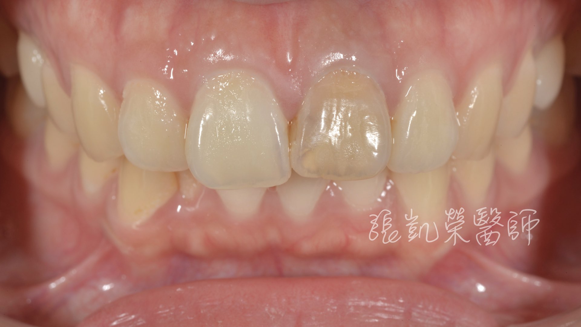 C小姐初到門診,年輕、氣質、美麗外,多了一份羞澀,榮醫師檢查後,發現C小姐門牙因為根管治療後,牙齒變暗變色,加上位置在門牙,所以他就不敢開懷大笑。 根管治療後,整個牙根都會變深,為了減少牙齦與全瓷冠透出暗影,所以全瓷冠之前,榮醫師先將牙齒內部做『齒內美白』,等牙根整個漂白後,再將全瓷冠放上去,讓C小姐可以開懷放心的笑囉~~