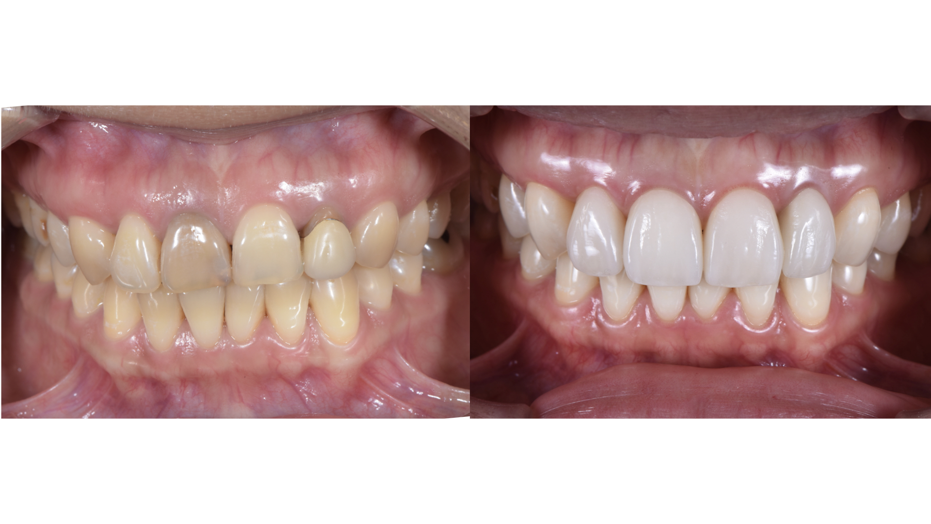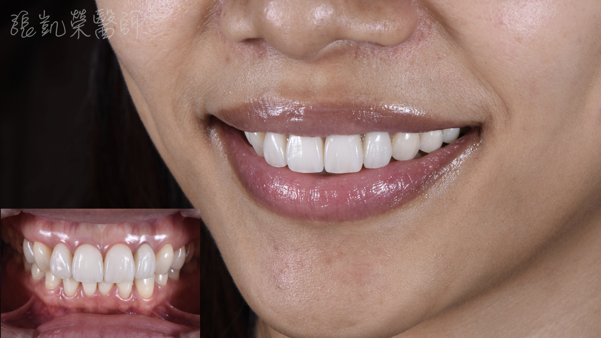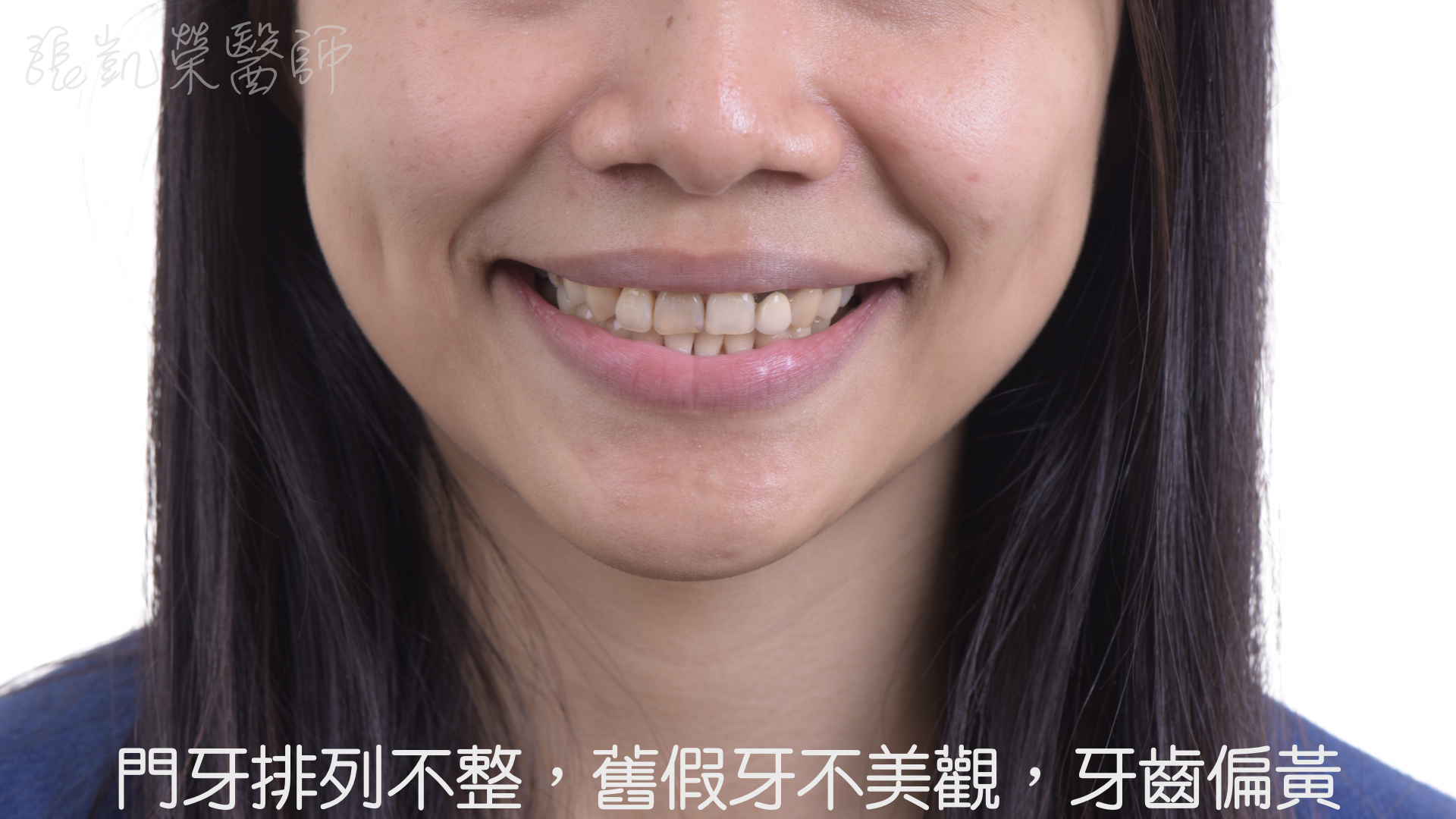 廖小姐對於門牙的舊假牙邊緣變黑很不滿意,而且牙齒偏黃,每次照相都只是微笑,總是對自己的笑容沒自信。 榮醫師診察後,除了牙齒顏色偏暗、舊假牙不美觀外,門牙排列與長度也可以適當做些調整,可以讓微笑曲線更協調。 榮醫師先做了數位模擬,讓廖小姐有具體實物可以參考,了解榮醫師建議的微笑曲線是否本人也滿意;溝通完畢後,做了全口美白、全瓷冠、全瓷貼片,除了改善原本在意的問題,也讓笑容和諧度整體提升,能有自信的笑容。