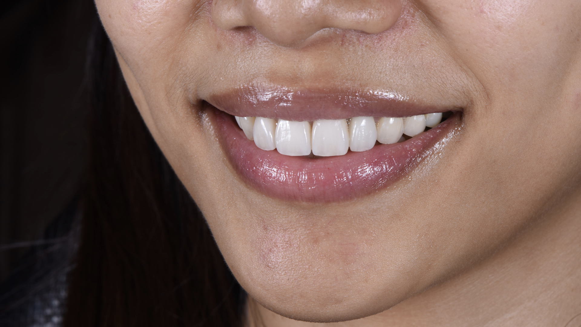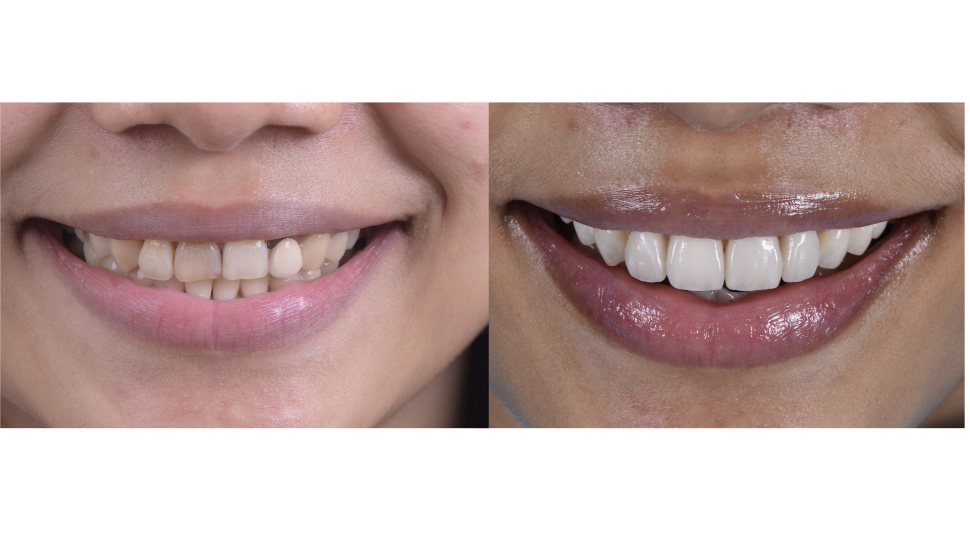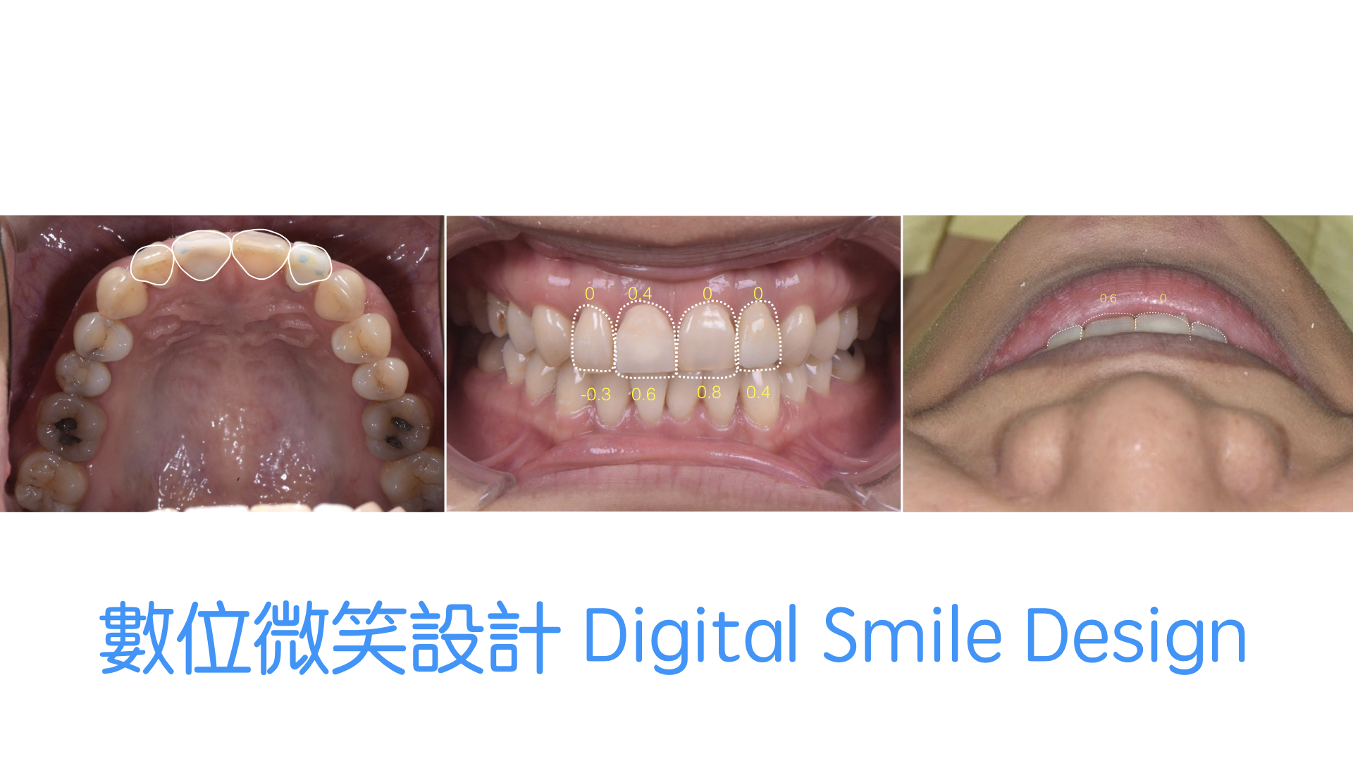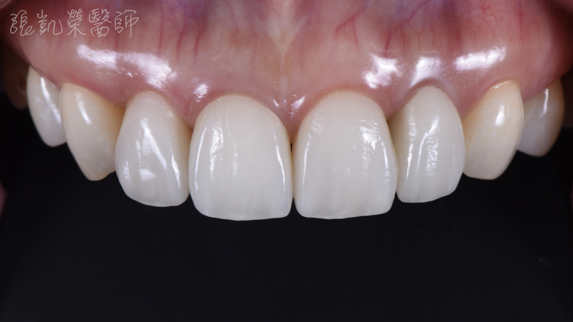 廖小姐對於門牙的舊假牙邊緣變黑很不滿意,而且牙齒偏黃,每次照相都只是微笑,總是對自己的笑容沒自信。 榮醫師診察後,除了牙齒顏色偏暗、舊假牙不美觀外,門牙排列與長度也可以適當做些調整,可以讓微笑曲線更協調。 榮醫師先做了數位模擬,讓廖小姐有具體實物可以參考,了解榮醫師建議的微笑曲線是否本人也滿意;溝通完畢後,做了全口美白、全瓷冠、全瓷貼片,除了改善原本在意的問題,也讓笑容和諧度整體提升,能有自信的笑容。