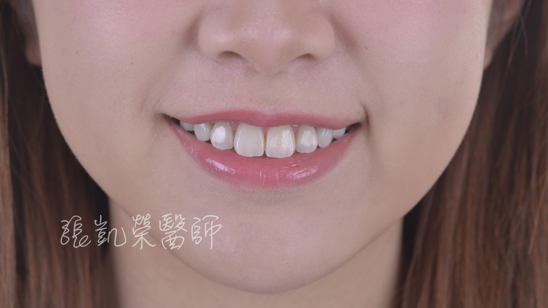 L小姐因為有其他因素,無法接受再次矯正,榮醫師就針對他的狀況,先做數位模擬(DSD, digital smile design)與L小姐溝通,並不是將牙齒內縮,而是將牙齒排列做些巧思,讓“視覺”比較不會有凸出來的感覺;模擬後,L小姐也滿意這樣的方向,於是就用貼片的方式,重新塑造微笑曲線,讓L小姐不再害羞於自己的笑容。