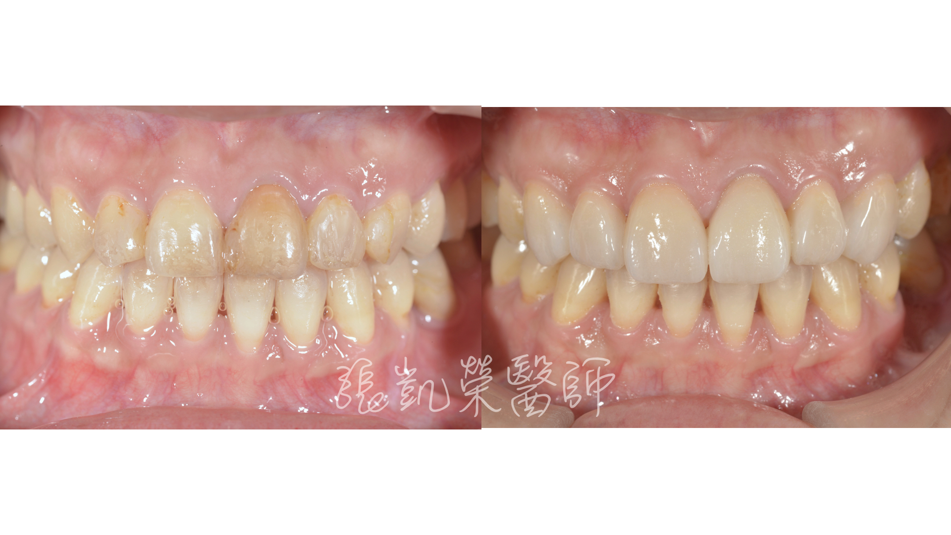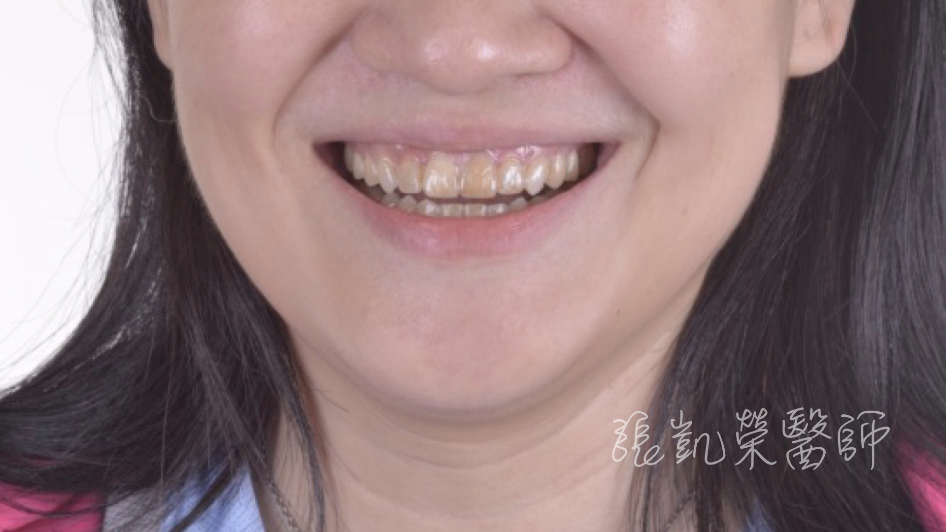 榮醫師檢查後,發現除了牙齒原本有許多舊樹脂填補外,側門牙是屬於比較小顆的錐狀牙,之前為了矯正,先用樹脂補出適當的大小,但經歷過三年,樹脂變色了,並且與牙齒的交界處產生色素沈積。榮醫師建議除了中門牙因為根管治療用全瓷冠保護外,其餘牙齒用貼片改變牙齒美觀與型態。