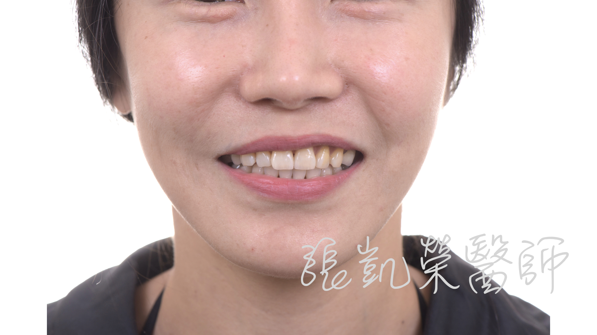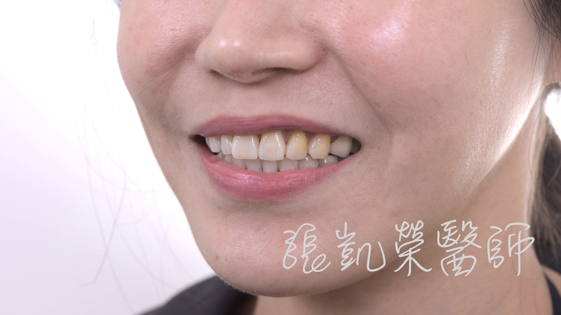 邱小姐因為牙齒排列不整,加上以前喜歡用門牙啃梅子的習慣,造成門牙磨損成“八”字型。 矯正後來到榮醫師門診,希望針對門牙磨損的部分做改善,但至於顏色想維持現在自然的狀態。 經評估分析後,除了牙齒磨損,還有牙齦高低不整的問題,這會影響貼片的型態;經討論、模擬、溝通後,先牙齦整形術,等待牙齦修復後,在處理門牙貼片,讓邱小姐重回自信的笑容。 牙齦高低不齊,影響牙齒型態