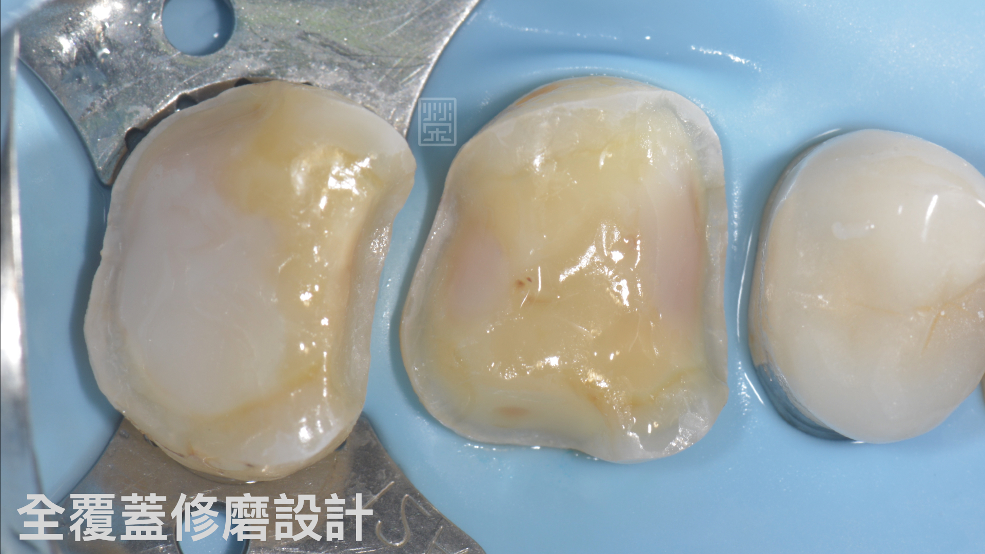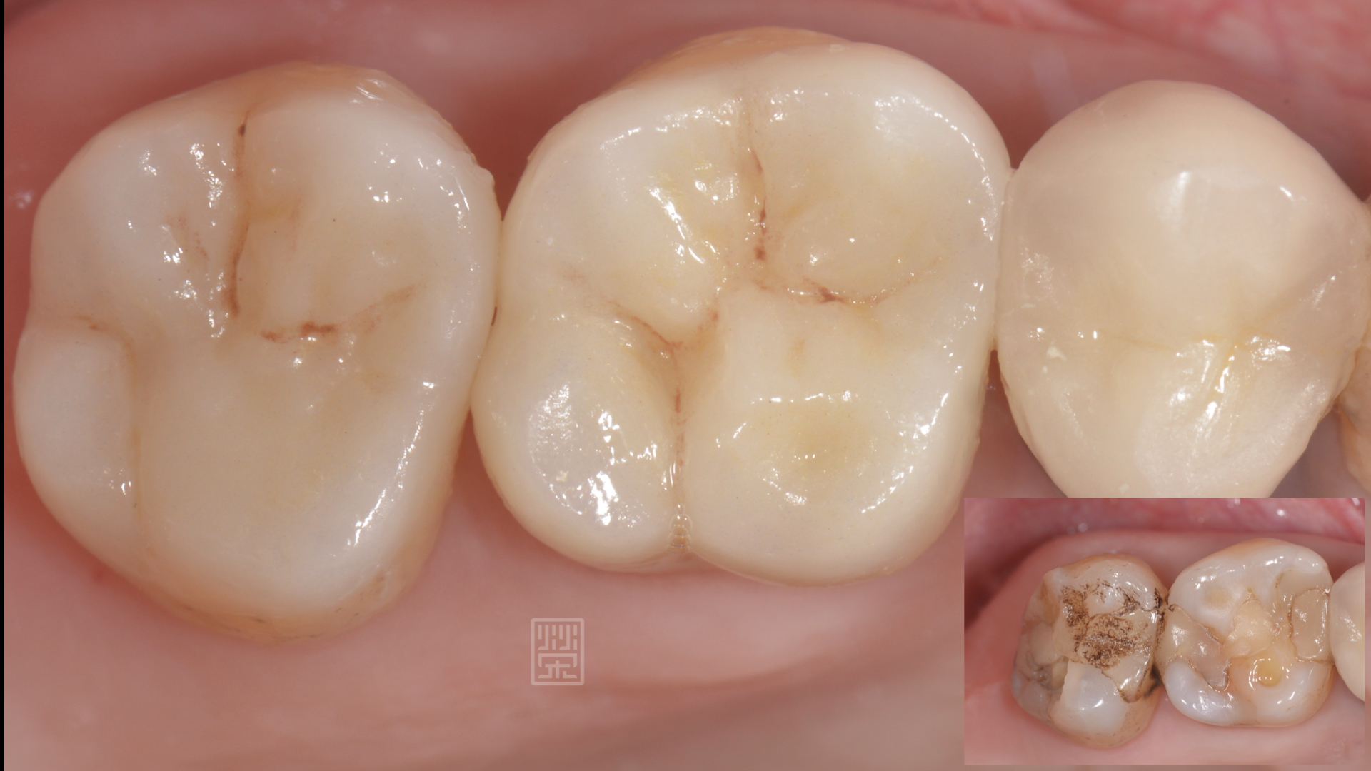 王小姐一直覺得左邊後牙咬起來不太舒服,有時候還會痠痛,特別是在咬硬的時候,榮醫師檢查後,發現因為下顎缺牙關係,造成下顎智齒往前倒,咬合干擾,造成上顎大臼齒嚴重磨損,而且上面的蛀牙也已經補了好多次。 榮醫師檢查後,發現上顎大臼齒有多次蛀牙填補、嚴重磨耗、樹脂有裂隙、產生二次蛀牙,將舊的填補物與蛀牙清除後,發現齒質喪失嚴重,建議利用全瓷嵌體兼具功能、健康的治療方式修復,達到減少齒質損傷的治療結果。 多次填補、嚴重磨耗、邊緣裂隙、二次蛀牙 智齒造成嚴重磨耗 位置難以清潔 清除後齒質嚴重喪失 清除後齒質嚴重喪失 全瓷嵌體完成 全瓷嵌體完成