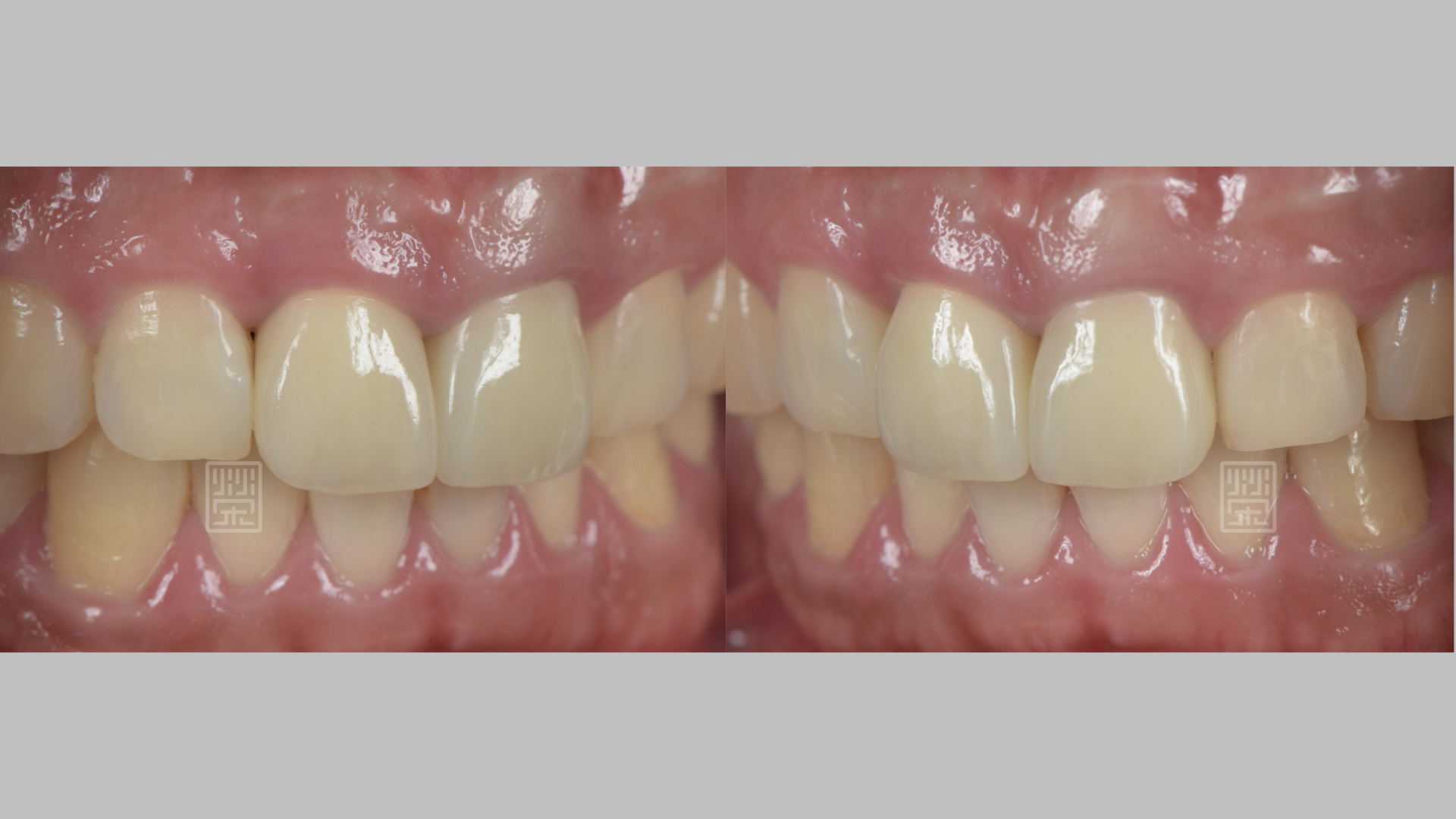 王先生多年前完成假牙治療,這陣子突然咬東西會覺得不舒服,而且覺得假牙變長、牙齦邊緣變黑。 榮醫師檢查完後,發現除了舊的假牙邊緣變色外,還有個很嚴重的問題,因為很年輕的時候牙齒就根管治療,牙齒齒壁很薄,當時釘子很粗壯,長期下來,牙根已經產生裂痕。 拆下假牙後,果不其然在牙根中看到裂痕,跟王先生解說後,告知無法保留牙齒,討論後決定以植牙修補這顆牙齒,再將側門牙的舊樹脂,利用全瓷植牙之台與全瓷冠修復,恢復美觀與健康。 假牙邊緣變色、樹脂變色、牙齒變長 牙根有裂痕 植牙臨時假牙 全瓷支台 植牙全瓷冠完成