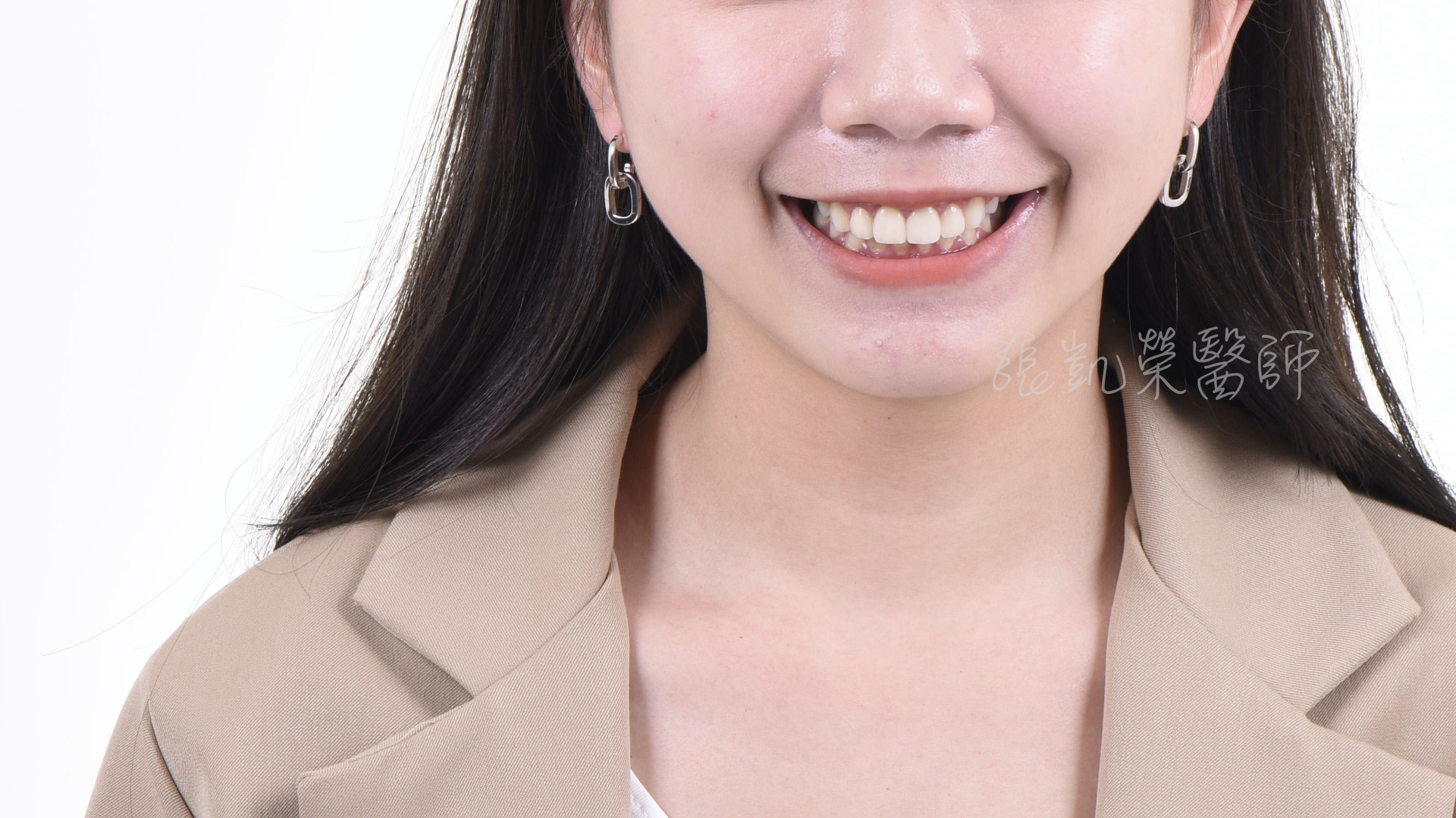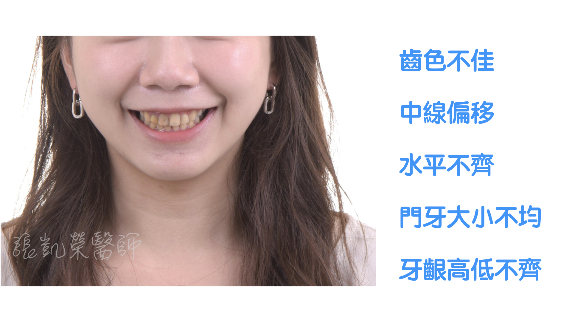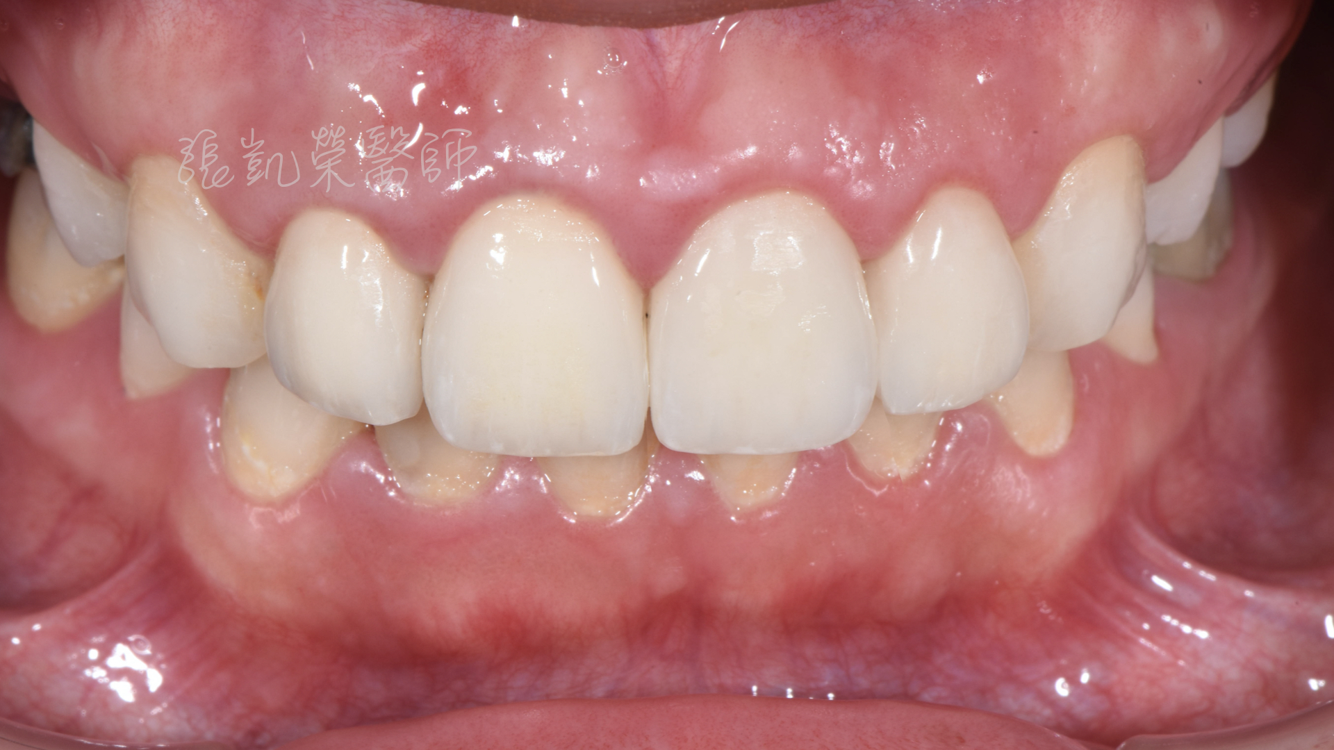 榮醫師,我牙齒顏色不好看,可以做全瓷冠改善嗎? 陳小姐矯正結束後,覺得牙齒顏色不好看,想要把門牙都做全瓷冠改善。 榮醫師檢查後發現,除了牙齒顏色外,還有中線偏斜、水平不齊、門牙大小不均、牙齦高低不齊等問題。 榮醫師建議先做牙齦整形術,將牙齦的位置調整齊,再用美白讓牙齒顏色亮白。 但除了做過根管治療的牙齒,牙齒較脆弱用全瓷冠修復外,其餘兩顆門牙為了減少傷害,用貼片修復,可以改善型態與大小,讓整體顏色、形態、中線水平做一併調整。 數位美學設計